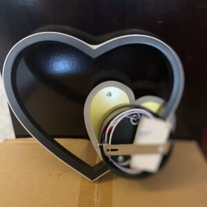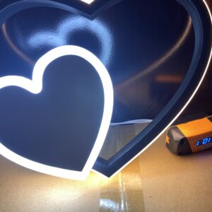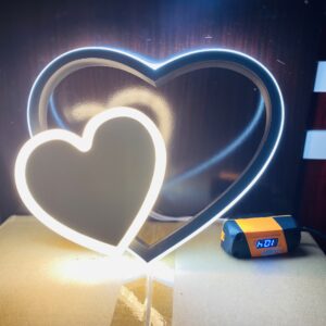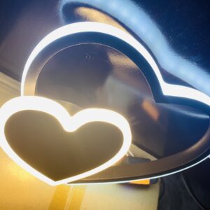 Mang phong cách hiện đại, thiết kế hình trái tim với sự kết hợp 2 màu sắc làm điểm nhấn, phần khung 2 hình trái tim với kích thước nhỏ lớn xếp sau nhau tạo nên sự liên kết đem đến ý nghĩa tình yêu đoàn viên. Tạo điểm nhấn nổi bật của không gian ngay cả khi đèn không bật